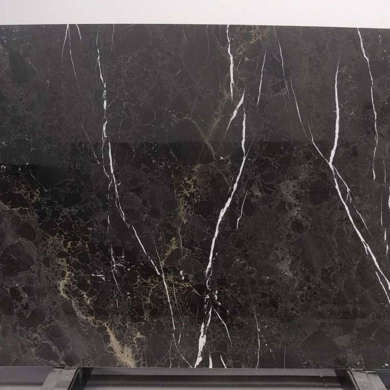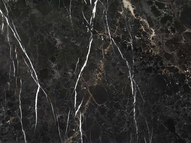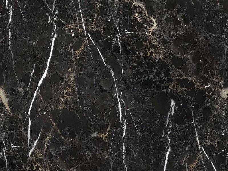 Такой рисунок на черном мраморе по праву можно назвать экзотическим. Сочетание черного, белого и золотого идеально подойдет как для столешницы, так и для пола. Современные жилые комплексы премиум класса часто используют мрамор для оформления пола, что придает помещению классической сдержанности и изысканности.