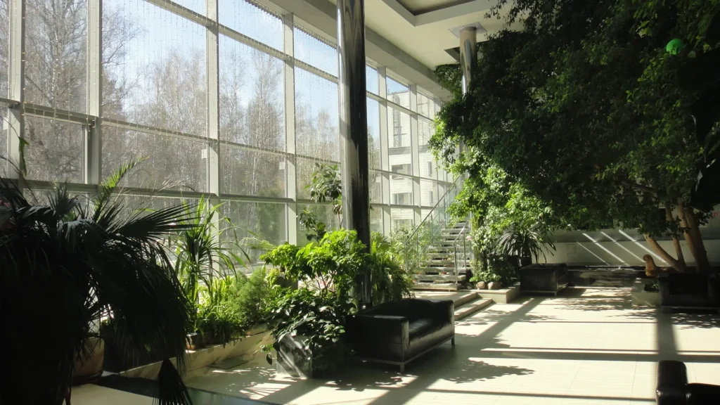 Выступающие крепежные детали маскируются декоративными эффектами. В результате дизайн зимнего сада или атриума приобретает завершенность и благородный внешний вид.